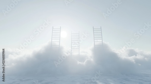3D ladders ascending into glowing clouds,climb ladder to next level,work online,Business concept a ladder Corporate of success,Overcoming business obstacles concept.