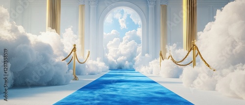 Blue carpet leading to the sky through a white archway in a heavenly space with golden columns and white clouds.