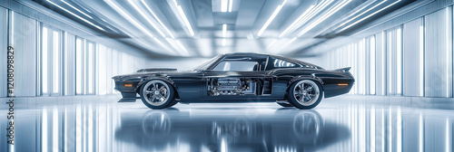 Ein futuristisches Auto mit transparentem Motor steht in einer sauberen, modernen Halle. Das Design kombiniert klassische Elemente mit futuristischen Linien, beleuchtet von weichem Licht