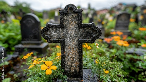 Stone cross grave marker with flowers in cemetery, blurred background