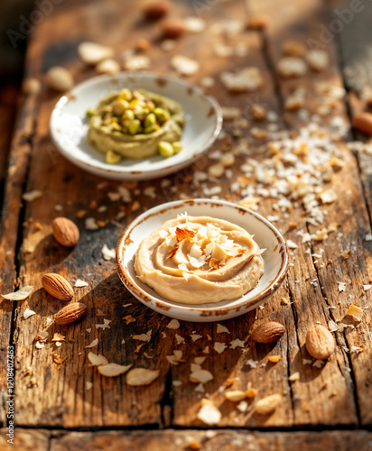 Artisanal Nut Butters on White Ceramic Plates: Pistachio, Macadamia, and Almond Butter with Rustic Wooden Background