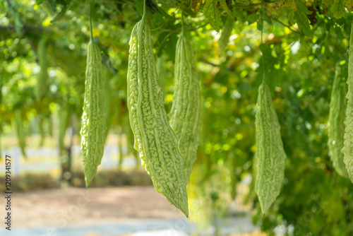 The fruit of bitter melon (also known as balsam pear, bitter cucumber, and bitter gourd) on the farm.