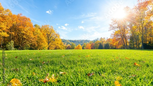 Autumnal park landscape sunny day, golden leaves, green grass. Ideal for nature, travel, or seasonal promotions