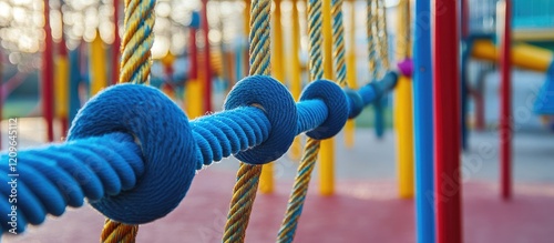 Rope climbing section in a vibrant children's playground with colorful obstacles for active and adventurous play experiences