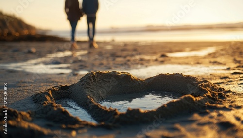 Sunset Beach Romance: A Couple's Walk and a Miniature Sandcastle Reflecting Golden Hour