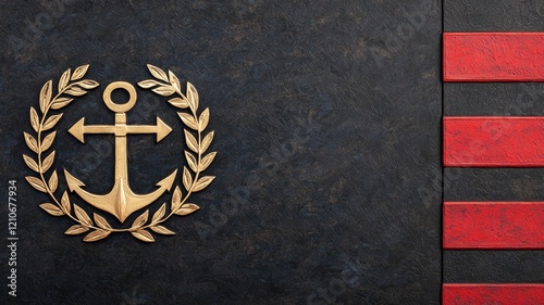 A gold anchor emblem surrounded by a laurel wreath against a dark background, complemented by bold red stripes.