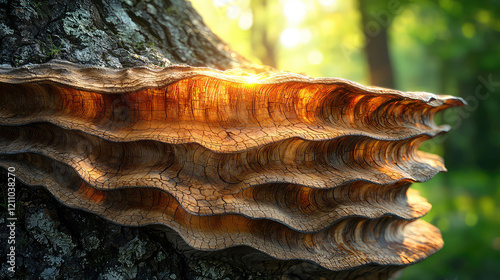 Close-up of a large, layered, brown fungus growing on a tree trunk in a sunlit forest.