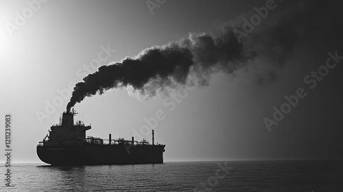 43.A stark image of a large ship at sea, with a smoke stack belching thick, poisonous gases under a clear sky. The image emphasizes the environmental consequences of industrial emissions, with the