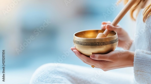 Close-up of a woman’s hands holding a golden singing bowl, tibetan singing bowls and healing meditations, therapy with a serene background, symbolizing mindfulness and relaxation