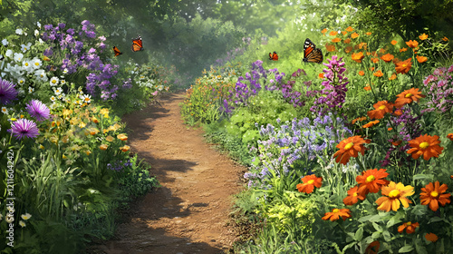Vibrant Garden Path: A Summer Walk Through Blooming Flowers and Butterflies