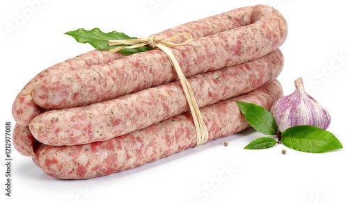 Pęta surowej białej kiełbasy związanej sznurkiem z liściem laurowym i czosnkiem na białym tle