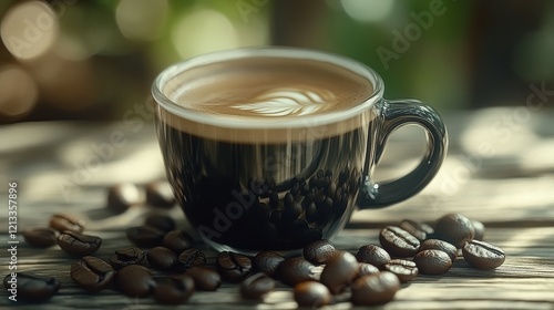 A cup filled with rich coffee sits atop a wooden table, with spilled roasted beans scattered around. Soft natural light highlights the beverage and setting