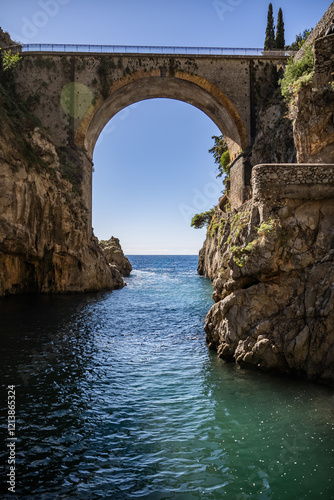 The sea enters the fjord at Fiordo di Furore on the Amalfi coast, Italy.