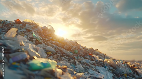 Sunset over a sprawling landfill highlighting waste and environmental concerns