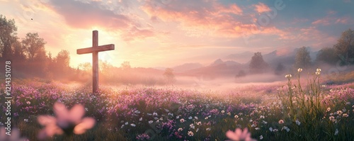 Easter morning sunrise illuminating a peaceful meadow with a wooden cross, blooming wildflowers, and a gentle mist