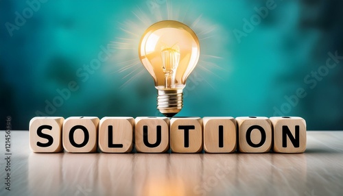 解決策を意味する英語単語のSOLUTIONの文字が書かれた木製のキューブブロックと電球のイラスト。 aiで生成