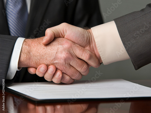 close up of two executives shaking hands over signed agreement