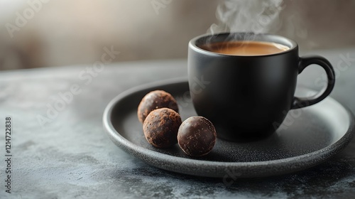 kawa, filiżanka, czekoladowe trufle, minimalistyczny, czarny mat, ceramika, tekstura kamienia, harmonia, prostota, elegancja, neutralne kolory, styl nowoczesny, inspiracja kulinarna, subtelne detale,