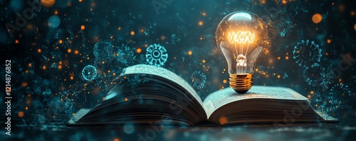 Knowledge and idea concept with an open book, glowing lightbulb, and digital gears, symbolizing innovation, learning, and creative thinking
