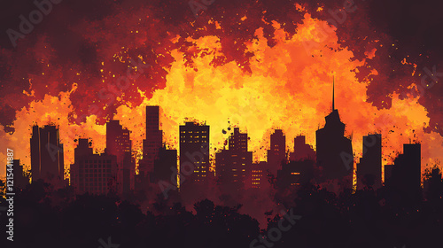 Dramatic urban skyline with a fiery, apocalyptic horizon. high rise buildings silhouetted against a blazing background. Blazing Horizon. Illustration