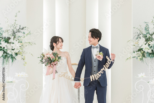 結婚式場でガーランドを持つ新郎新婦(ブライダル・ウェディング)