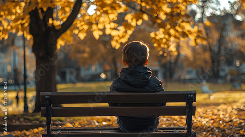 Child enjoys peaceful autumn afternoon in park surrounded by golden leaves
