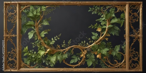 golden scroll with lush greenery and vines intertwined within an ornate metal frame , luxury decorations, floral patterns
