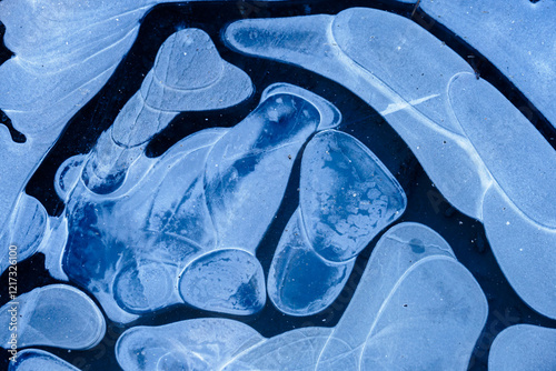 Zamarznięta powierzchnia kałuży. Kolor wody pod lodem jest czarny. Uwięzione powietrze tworzy nieregularne o obłych krawędziach kształty.