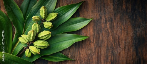 Garcinia cambogia fruit and green leaves on wooden background with Copy Space for text insertion
