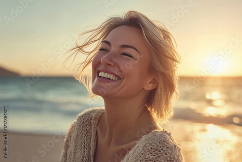 Serene middle-aged woman enjoying a peaceful moment on a sunny beach with ocean waves in the background, showcasing natural beauty, relaxation, and carefree emotions for lifestyle, travel, and wellnes