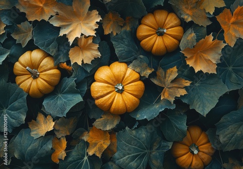 Beautiful Autumn Scene with Bright Orange Pumpkins Surrounded by Green and Yellow Leaves, Perfect for Fall and Thanksgiving Themes and Seasonal Decor Inspiration