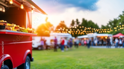 Vibrant food truck scene at sunset with illuminated string lights and bustling crowd enjoying outdoor festival