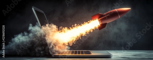 Laptop Rocket Launch Digital Art, Dark Background, Innovation Concept, 3D Render, Smoke, Fire Digital art, 3D rendering