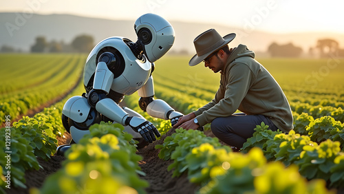 A humanoid robot and a male farmer work together in a green field, planting crops side by side during a warm sunset, exemplifying technology aiding agriculture