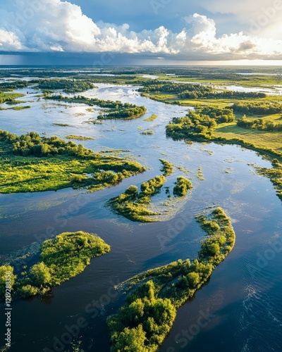 River delta flooded with green blue and brown color