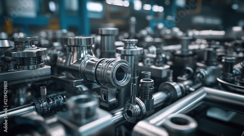 A photo image of various metal pipe connectors such as fittings, couplings, adapters, and valves in a warehouse or industrial setting.