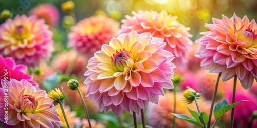 Captivating Long Exposure of Pink and Yellow Daleko Jupiter Dahlias in a Public Garden, Close-Up Blossoms Under Daylight