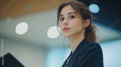 #1527258373Confident young businesswoman in a modern office, embodying professionalism and focus.