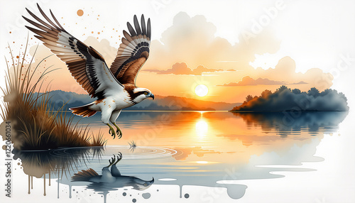 Majestic osprey hovering above lake at sunset, nature's beauty
