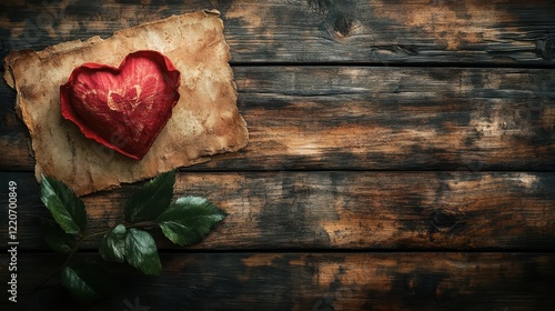 Vintage valentine postcard with heart on rustic wooden background for february 14th greeting cards