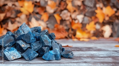 This image captures a striking pile of blue crystals on a rustic wooden table, surrounded by autumn leaves in a warm, inviting setting, showcasing nature's beauty.