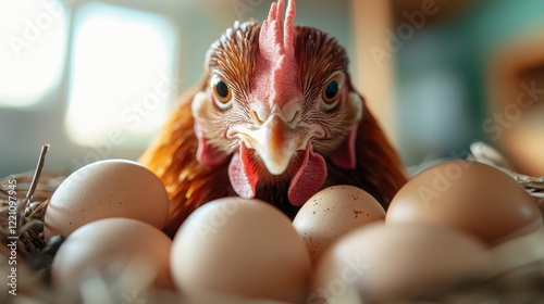 A vibrant hen carefully sits among freshly laid eggs, showcasing the natural connection between poultry and egg production in a cozy farm environment.