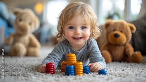 Happy toddler playing with colorful stacking toys on a cozy rug.