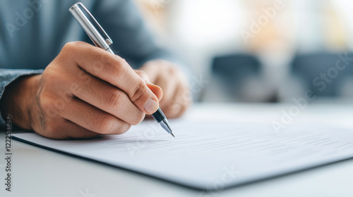 A close-up of a hand holding a pen, writing on a document for professional purposes.
