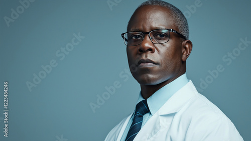 A doctor in a white coat wearing glasses and a serious expression, standing against a muted gray background with subtle, soft light framing their figure, symbolizing focus and resp