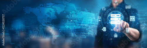 Businessman touching web hosting services, cloud hosting solutions, dedicated server options, domain management systems, data backup strategies, scalability features, and global communication systems.