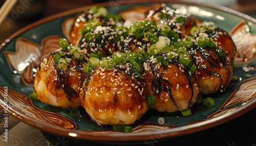 plate of takoyaki, beautifully decorated with layers of sauce, topped with bonito flakes and scallions, set against a rustic wooden background