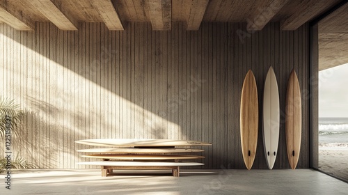 A minimalist beach shack with surfboards stacked neatly against the wall. digital