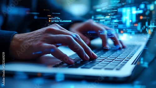 Digital technology, software development concept. Coding programmer, software engineer working on laptop with circuit board and javascript on virtual screen, internet of things IoT