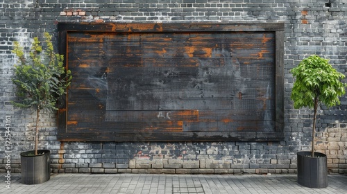 Vintage black wooden billboard on brick pavement for cafe and shop advertisements. Copy space available.